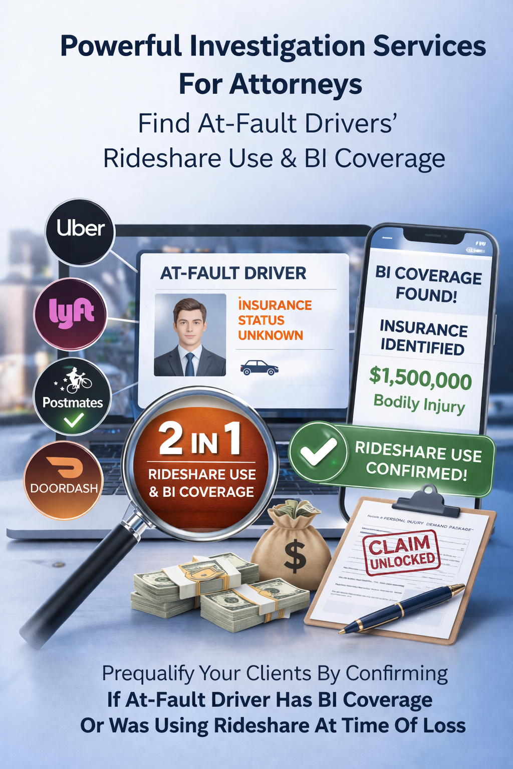 Stop wasting time on cases with no coverage. Our verification service allows attorneys to quickly identify whether an at-fault driver has bodily injury coverage or was engaged in RIDESHARE activity, eliminating the need to chase down adjusters or allocate internal resources to uncover basic claim viability.