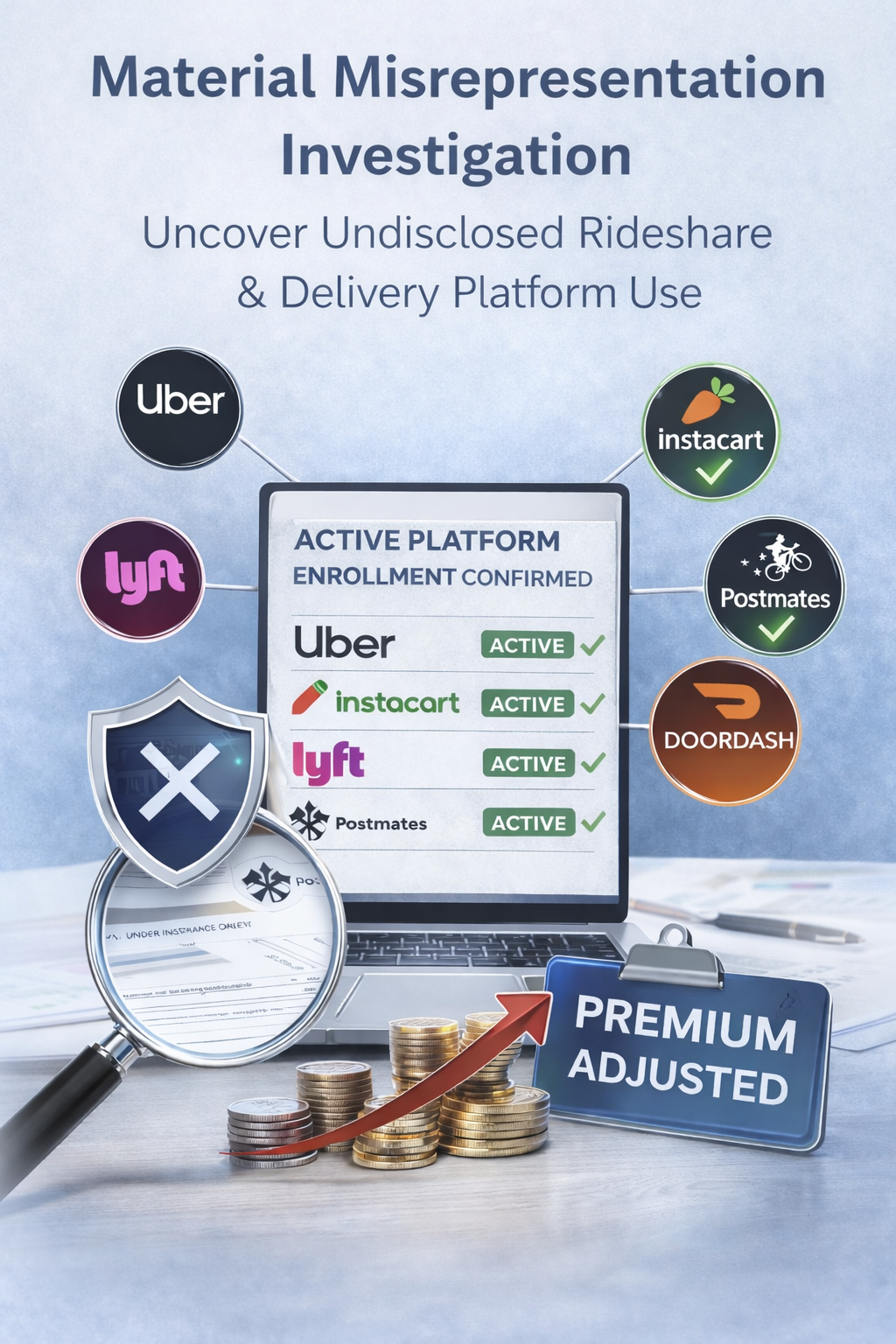 Our Material Misrepresentation Investigation reveals undisclosed rideshare and delivery platform activity that may not appear during traditional underwriting reviews. Even when platform use did not contribute to the loss, identifying this exposure provides insurers with critical insight into the insured’s true risk profile. This allows carriers to address potential material misrepresentation, adjust future rates, apply appropriate endorsements, and better manage underwriting exposure.